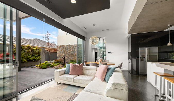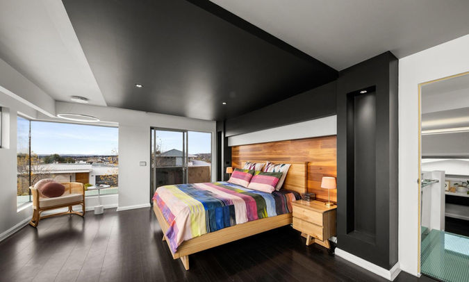 This beautiful home we designed and built in Wright provides a lot of living on a small block. Built on only a 450m2 block, this house was designed to maximise every inch with functionality and aesthetics in mind. The home includes high-end finishes and stunning features like an a glass staircase with LED lighting, high ceilings, concrete countertops, a theatre room complete with bar and a lovely alfresco area.